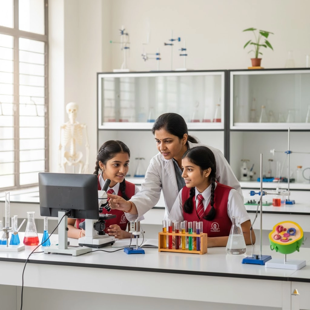 Microscopes, prepared slides, anatomical models, and teaching aids for structured life science learning and observation.